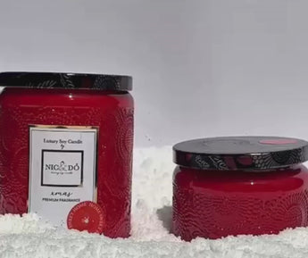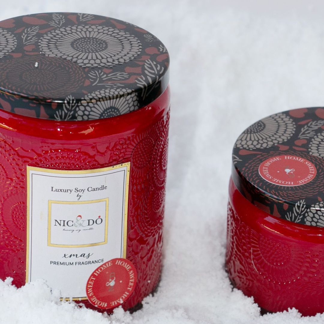 Set de dos velas, mediana (8.04 oz/250 g) y chica (4.7 oz/140g), ambas en finas bases rojas en relive y con tapa metálica grabada.